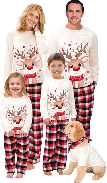Crie memórias MÁGICAS! 🦌 O Pijama de Natal Familiar (Conjunto) é perfeito para a sua foto em família. Roupa de dormir longa e confortável com estampa de Alce! Ideal para todos: pais, crianças e até o cão. Aproveite o MEGA DESCONTO especial de época!